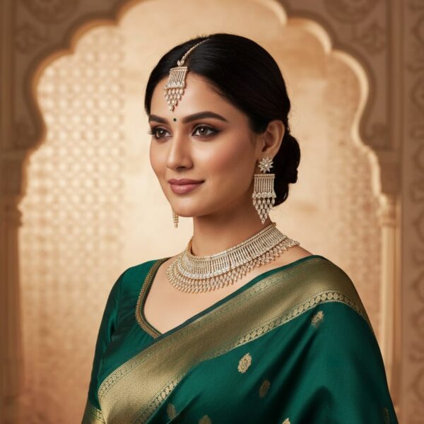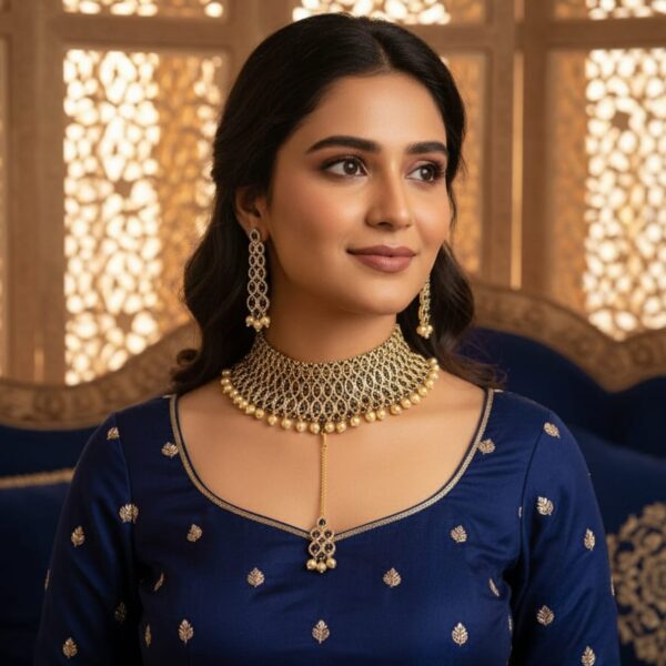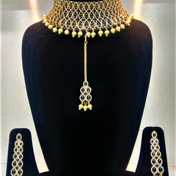 Amercican Diamond Chick Patti Set in Rose Gold with Blue Strings