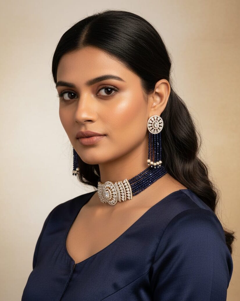 DETAIL:- Amercican Diamond Chick Patti Set in Rose Gold with Blue Strings